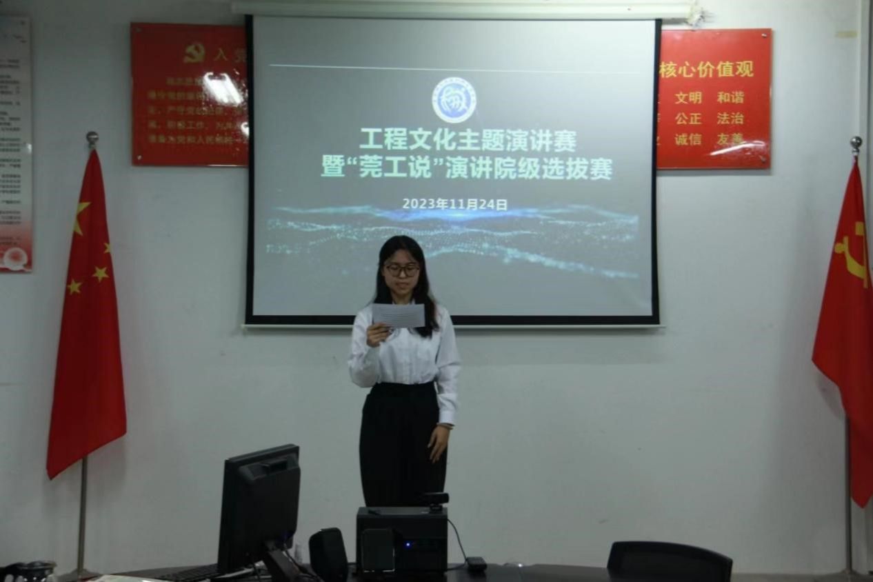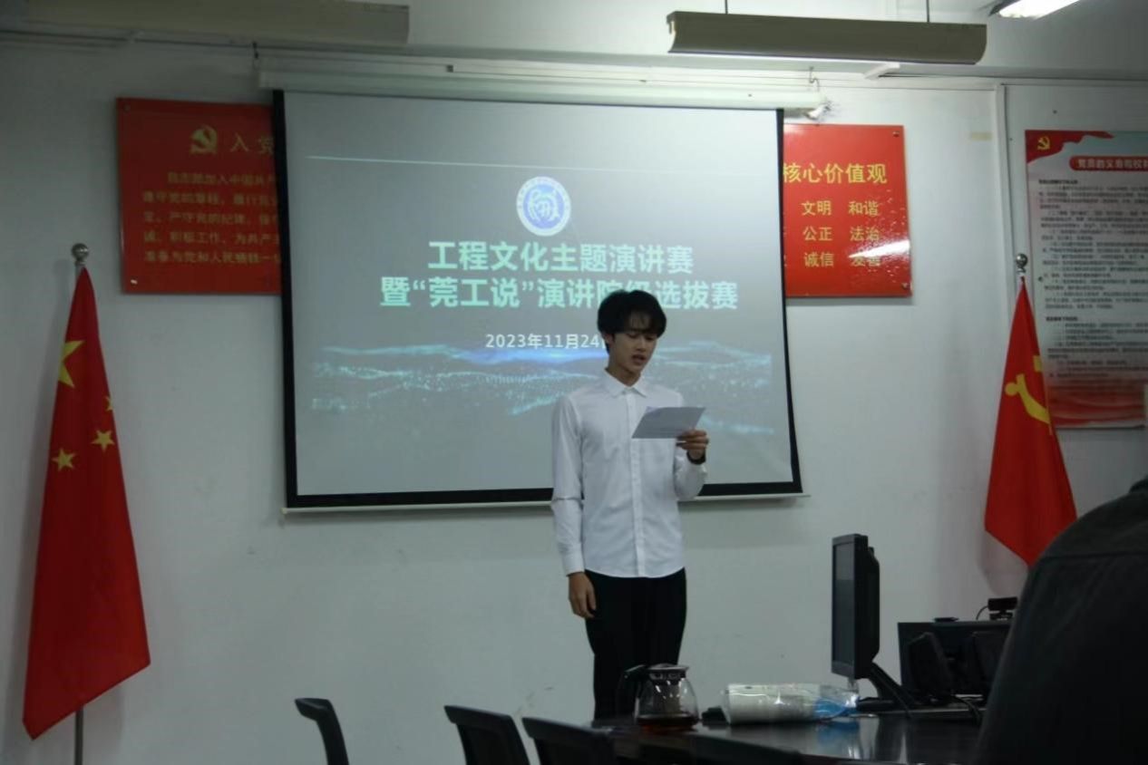 2023年11月24日,太阳集团tyc151在综合实验楼12A204举办工程文化主题演讲暨“莞工说”演讲比赛院级选拔赛。本次比赛邀请了机械工程公司党委副书记邓维伟、公司团委副书记郭家润以及东莞广播电视台编导曾庆、江梓晗担任评委。