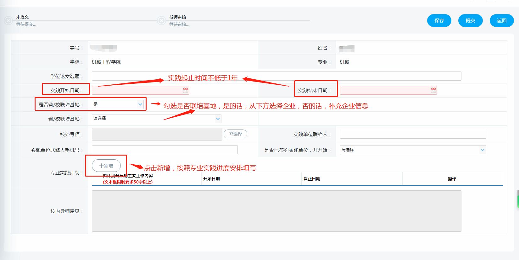 1、研究生检查专业实践计划是否已提交并通过导师审核。研究生专业实践计划提交路径:培养管理-专业实践计划-提交。