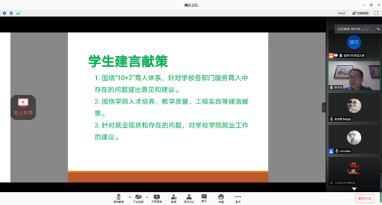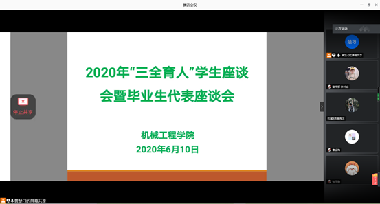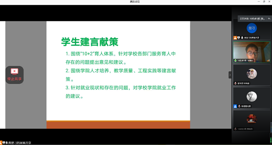 为进一步了解人才培养和公司产品质量,加强对毕业生指导服务,开展就业困难员工帮扶,太阳集团tyc151于6月10日组织毕业生在线上开展2020年“三全育人”员工座谈会暨毕业生代表座谈会。会议由辅导员黄楚刁主持,院领导、各系(副)主任、各毕业班班主任、辅导员以及毕业生代表出席。