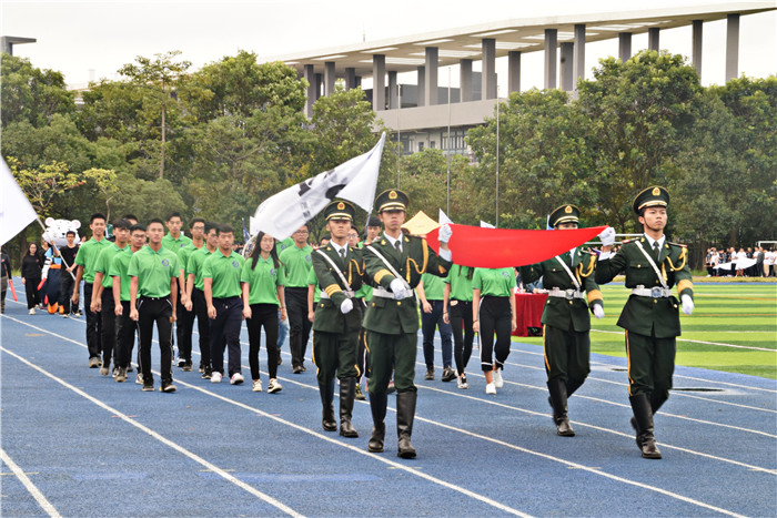 开幕式伊始,主持人介绍列席嘉宾,分别是副经理黄辉宇,党总支副书记陈举铭,团总支书记、辅导员肖毅,辅导员黄楚刁,辅导员陈凤宜,辅导员罗嘉楠,武静老师。紧接着,国旗护卫队踏着整齐的正步,举着国旗庄严进场。而后,青马班方阵、团学方阵、各班级代表方阵陆续进场,整齐的步伐、各具特色的旗帜与服装、气势雄壮的口号,彰显出了太阳集团tyc151的风采。方阵归位后,全体人员奏唱国歌。接下来,TNT协会带来了精彩的舞蹈表演,而由团学和青马班代表方阵合唱的歌曲“我相信”更是点燃了全场人员的热情。随后,陈书记致开幕词。陈书记强调同学们要发挥“友谊第一,比赛第二”的精神,希望选手们尊重裁判和其他选手,发挥顽强拼搏的精神。最后,运动员代表和裁判代表分别进行宣誓,黄经理宣布运动会正式开始。