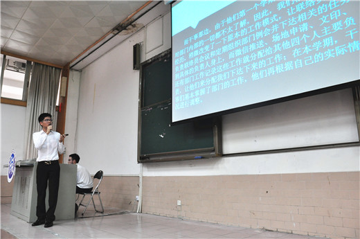 大会以回顾视频的播放拉开了帷幕,主持人宣布评比成绩主要由初评和现场评分组成,现场评分主要取决于各部门一年工作的展示。在部门展示中,各部长们主要从工作报告,内部建设,总结与展望以及部长寄语四个方面总结自己部门一年来的工作与收获。在一年的工作与学习中,部长们与干事们秉持“协同上下,服务团学”,积极认真地做好每次活动。其中,学习部部长用四个词“迷茫,担心,学习,反思”总结自己一年来的经历;宣传部部长希望大家不要忘了彼此;自律部部长认为每个部门就是一个家,需要干部与干事一起传承下去。