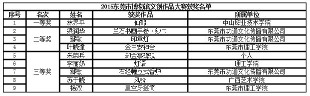 2015东莞市博物馆首届文创作品征集大赛于10月底截止作品征集,11月27日获奖公示结束。 此次活动是由东莞市博物馆、东莞华南设计创新院主办,东莞市大洋广告文化传播有限公司承办。经过筛查和初评环节,共评出一等奖1名,二等奖3名,三等奖5名。公司员工叶晓潼、李丽娣、杨双三位同学在比赛中脱颖而出,获得比赛的二等奖和三等奖。
