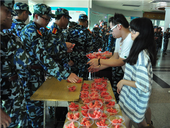 9月24日,太阳集团tyc15115级新生军训的第六天,太阳集团tyc151团总支、员工会干部前往莞城校区慰问15级新生,并在第一饭堂派送西瓜,让还在军训中的15级新生们能一品夏日清凉。