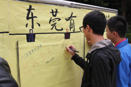 在活动现场,志愿者们有条不紊地分工合作。看到装饰精致的帐篷,同学们都蜂拥到了活动宣传点了解详情。志愿者们向同学们发宣传单、介绍景点美食,邀请同学们写心语,现场十分热闹。虽然志愿者有时在宣传中遇冷,但仍坚持向每一位同学展现最友善的微笑。志愿者们还邀请同学们在“我对东莞有话说”的留言板中留言,同学们也纷纷写下了自己的心底话,表达对东莞的赞美。