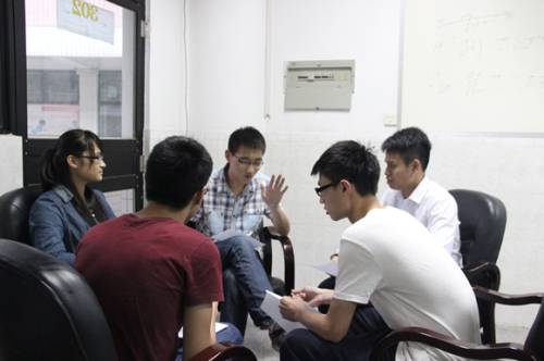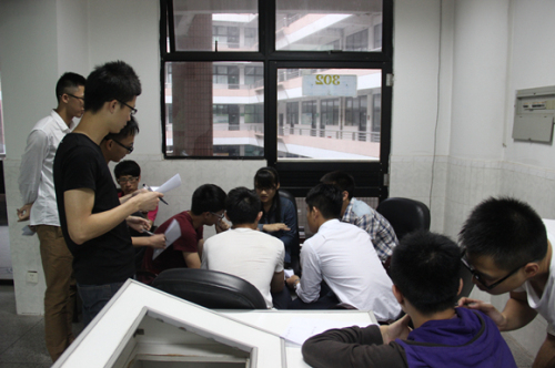 经过几个小时的休息,委员候选人们迎来了第二轮的筛选。下午的面试以候选人员被分成两组轮流进行无领导小组讨论进行。每组候选人员在抽到自己要策划的节目后便开始了为时20分钟的紧张讨论之中。在讨论之中,各候选人员各抒己见并快速的进行讨论总结,一份有效的策划方案也很快成形。讨论结束,在由小组代表向面试官们进行小组讨论总结陈述后,面试进入最后的答辩环节。面试官们就小组的讨论经过和小组策划方案对候选人进行了各方面的提问,在肯定候选人们表现的同时也指出了候选人员所犯的错误和不足之处。在最后,肖毅老师还说到“业成于勤而荒于戏”,他告诫各候选人员,只有在平时不断总结工作,积累经验,才能让自己不断的成长。