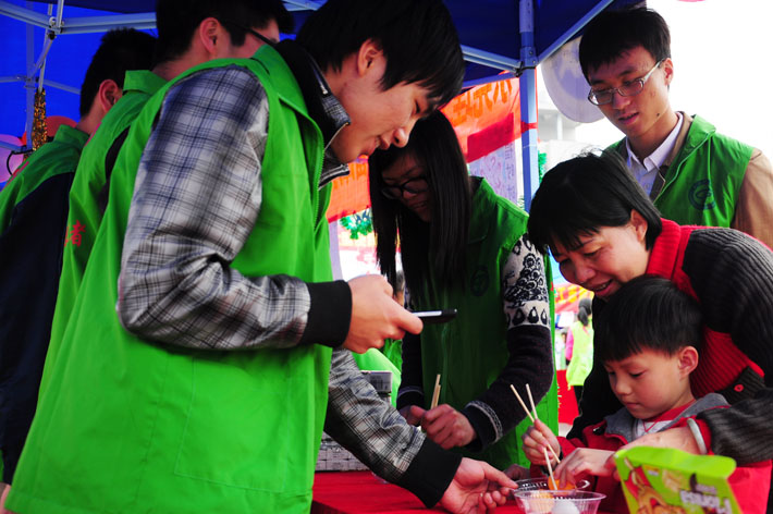 活动现场,大舞台上有志愿者们精心准备的精彩表演,舞台下男女老少看得津津有味。广场空地上,无数顶小帐篷竖立,志愿者们在各自的摊位上井然有序地做着准备工作,现场十分热闹。