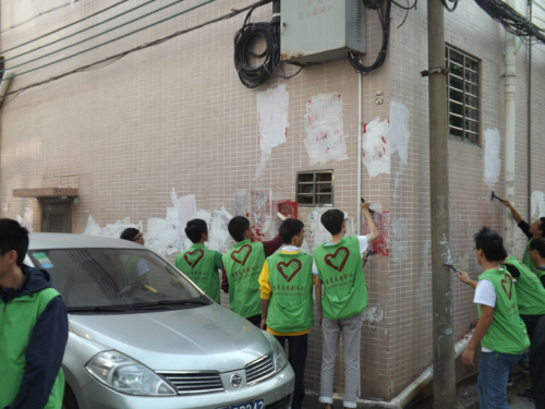 活动开始前,社工对这次志愿活动的意义进行了讲解,并给志愿者进行了简短的培训,同时强调了活动的安全事项。志愿活动正式开始后,黄社工把志愿者分成三小组。一组留守大本营,主要负责向群众进行环保知识与环保现状的讲解,让他们意识到提高自身环保意识的重要性。另外两组由社工带领,带着喷水器、刷子、铲子等工具,到街巷各处去查看,对那些广告、宣传单等进行清除。最后,全体成员在大岭山广场对这次活动的看法与感受进行了的交流,并合影留念。