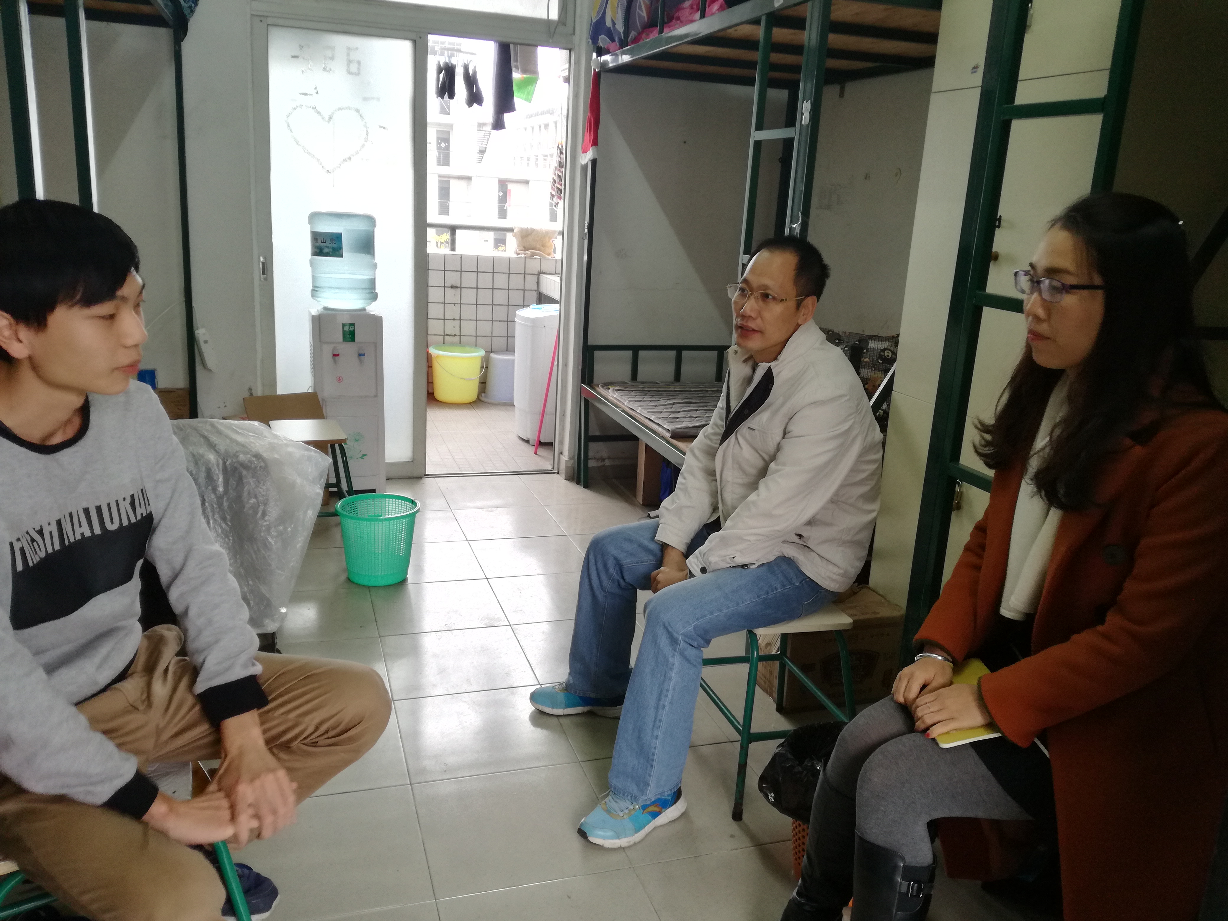 2018年1月28日,机械工程公司党总支副书记陈举铭带领学工队伍走访员工宿舍,了解员工假期的安排,叮嘱员工在校按要求做好留校登记、与家长密切联系使家长放心、,回家提前做好安排、宿舍关好门窗断水断电、注意人身财产安全等,给寒假留校员工送上温暖的慰问。