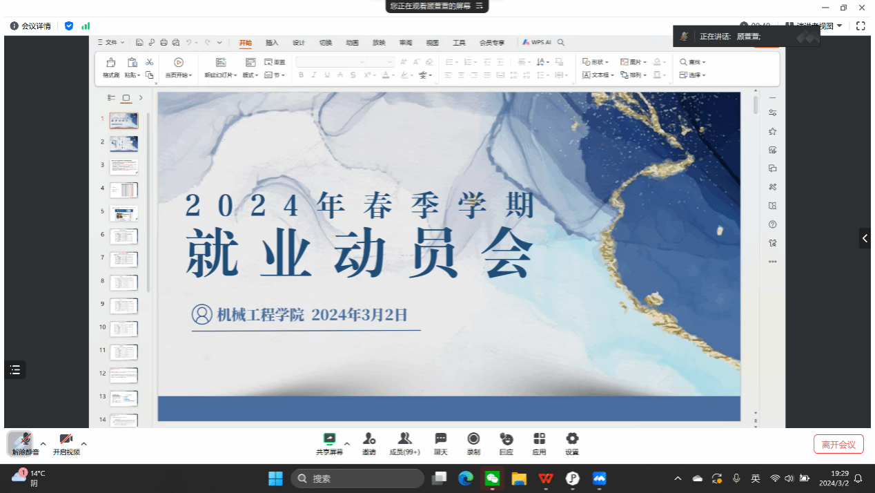 会上,年级辅导员顾萱萱为同学们详细解读了毕业去向填报的相关要求及填报方式。她指出,正确填报毕业去向是毕业生顺利走向社会的重要一步,同学们在填报过程中要仔细核对信息,确保填报的准确性和完整性。随后,顾萱萱根据专业特点向同学们解读了2024届毕业生就业形势,指出要进一步增强紧迫感和危机感、夯实专业基础,并结合近期校内宣讲会及专场招聘会安排,要求同学们抓紧春招黄金时间,积极奋战到求职中去。