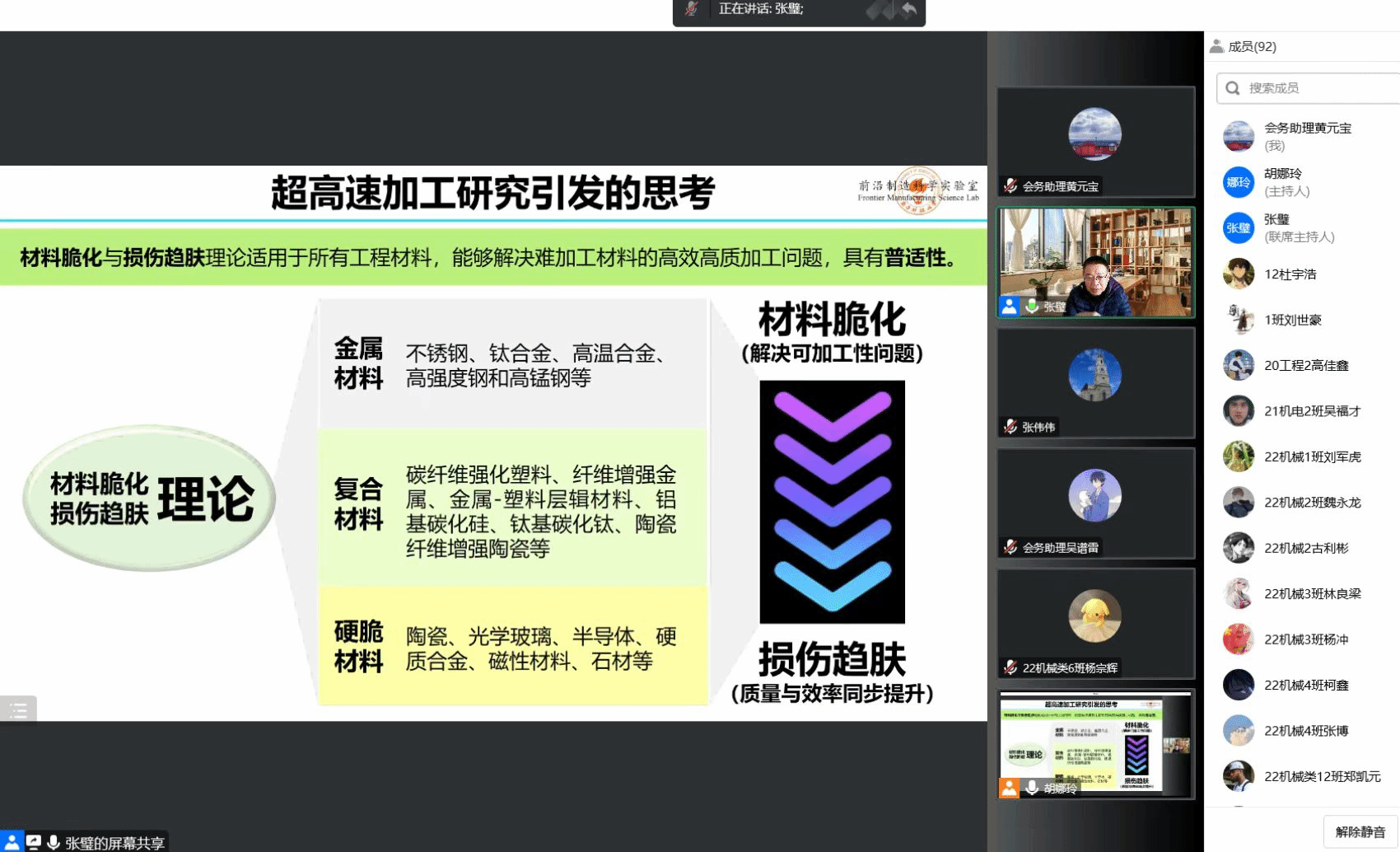 南方科技大学张璧教授作题为《漫谈学术研究》的学术报告,以漫谈学术研究为主题,从超高速钢加工切入,细致入微地为研究生们讲解了学术研究应有的思维和思考,强调研究要有理论基础、哲学思维、独立思考。