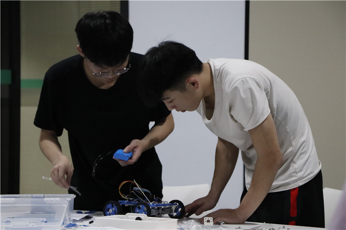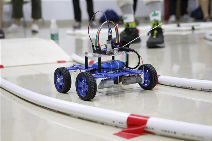 拼接电路、拼装车身、调试蓝牙,各队伍分工明确、井然有序地完成小车拼装。在工作人员确认拼接正确后,便开始用手机调试小车。调试完毕后,进入操控竞速阶段,参赛选手们需运用手机操控小车通过障碍赛道。为了保证比赛公平性,本次比赛采用超声波计时器计时,以减少成绩的误差。赛道分设多个区段,考验选手的操作能力及对小车结构的设计合理性。在比赛过程中,大多数队伍都通过了赛道,顺利完成比赛,其中不乏优秀的选手,平稳迅速地通过赛道,并飞跃了木桥。也有不少队伍因连续操作失误,使小车冲出赛道而抱憾离场。此外,有少数队伍未能按时完成小车拼装。