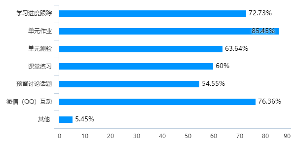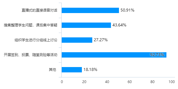(2)教学互动:调查结果显示,公司任课教师采取多样化的方式与员工在课堂上进行交流互动,其中92.73%的任课教师在线上开展了签到、投票、随堂测验活动,还有教师通过直播式的语音对话;搜集整理员工问题,课后集中答疑;组织员工进行分组讨论,等等。