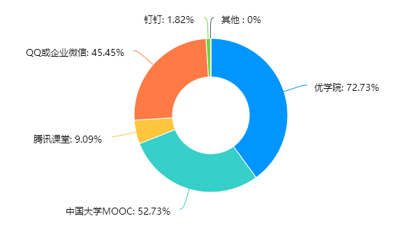 关于采用的线上教学平台,教师主要使用的平台从多到少依次是优公司、中国大学MOOC(爱课程)、QQ或企业微信、腾讯课堂以及钉钉。