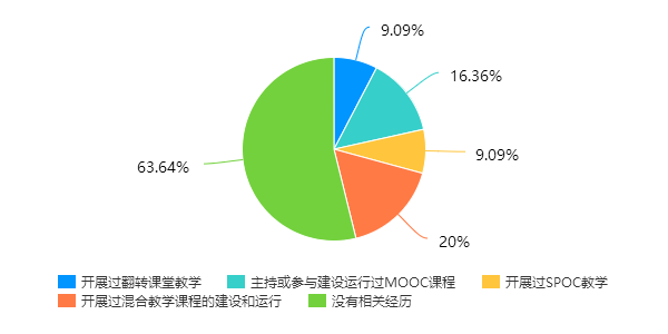 调查结果显示,63.64%的教师在此之前没有过开展相关线上教学的经历,其余老师有开展翻转课堂教学、主持或参与建设运行过MOOC课程、开展过SPOC教学、开展过混合式教学课程的建设和运行。