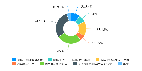 调查问卷结果显示,绝大部分任课教师认为与传统课堂相比,线上教学的教学效果还是难以保证。34.55%的教师认为线上教学的教学效果只能达到传统课堂70%-90%的教学效果,7.27%的教师认为只能达到50%以下的教学效果。这与线上教学“无法及时观测员工学习效果”、“师生互动难以开展”密切相关。教学平台不稳定、拥堵也是亟需解决的问题。