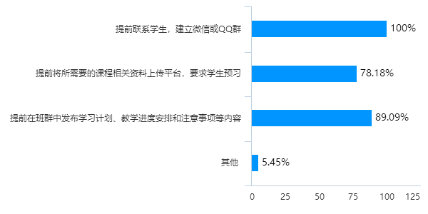 (1)教学准备:公司100%的任课教师在课程开始之前都提前联系了员工,并建立了微信或QQ群,89.09%的教师提前在班群中发布了学习计划、教学进度安排和注意事项、78.18%的教师提前将所需要的课程相关资料上传平台。可见,公司任课教师在课程开课前,都做了充足的教学准备。