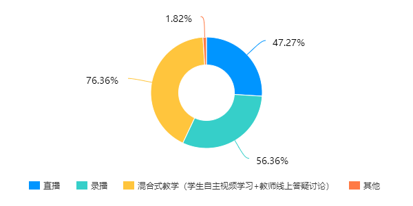 教师开展线上教学的方式,主要包括混合式教学(员工自主视频学习+教师线上答疑讨论)、录播和直播等。一般是采用两种教学方式混合,只使用单一教学方式的较少。