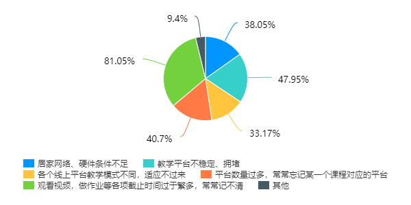 调查结果显示,53.19%的员工喜欢混合式教学,即员工自主视频学习+教师线上答疑讨论的线上教学模式更受同学们欢迎,从员工在线上教学遇到过的问题可知,38.05%的员工居家网络、硬件条件不足的困难,还有47.95%的员工在上课过程中遇到了教学平台不稳定、拥堵的问题,这些客观的原因导致一部分员工没有办法参与直播的教学模式,因此不难理解他们更倾向于混合式教学。