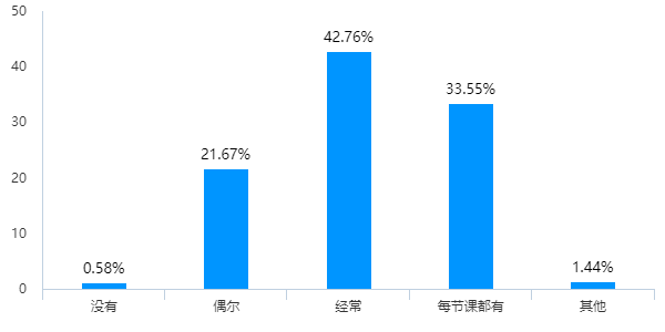 由调查可知,线上教学课堂中老师经常与员工互动的占比为42.76%和老师每节课都与员工互动的占比位33.55%,说明老师们普遍互动频率都很高。