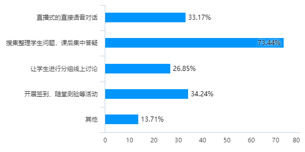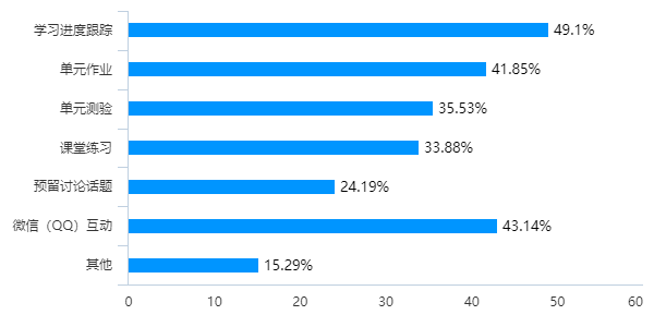 (1)员工喜欢的教学互动:调查结果显示,员工最希望老师进行的互动交流依次为搜集整理员工问题、课后集中答疑;直播式的直接语音对话;开展签到、随堂测验等活动;让员工进行分组线上讨论;其他。