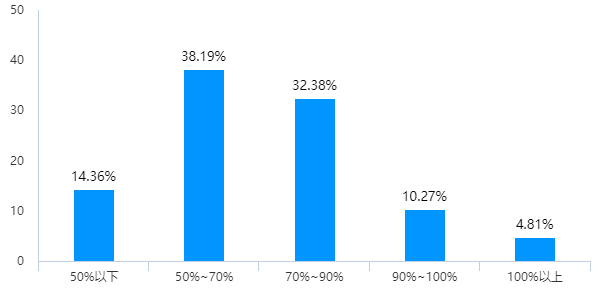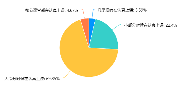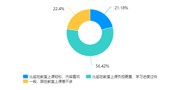 在线上教学中由于缺少老师面对面的监督,有22.4%的员工在线上课堂中只有小部分时候认真上课,但是绝大多数员工的听课状态是大部分时候在认真听讲学习,说明员工上课积极性高以及自律管理强。