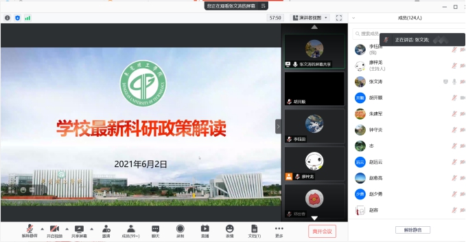 随后,张文涛汇报本学期公司横向科研情况,并解读《太阳集团tyc151校外获得竞争性科研项目经费使用管理实施细则(试行)》相关政策。