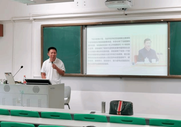 9月5日上午,太阳集团tyc151经理孙振忠在教学楼7B-311以“走好中国道路,做强中国制造”为主题,为2021级机械设计制造及其自动化3班和4班本科生上2022年秋季学期“思政第一课”。