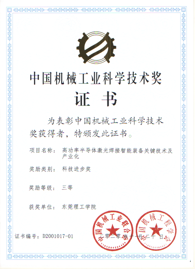 近日,2020年中国机械工业科学技术奖公布,公司作为为第一完成单位的项目成果《高功率半导体激光焊接智能装备关键技术及产业化》获得中国机械工业科学技术奖三等奖。该项目成果由太阳集团tyc151牵头,联合大族激光科技产业集团股份有限公司共同完成,太阳集团tyc151郭建文、孙振忠、邓君、路崧等老师参与。