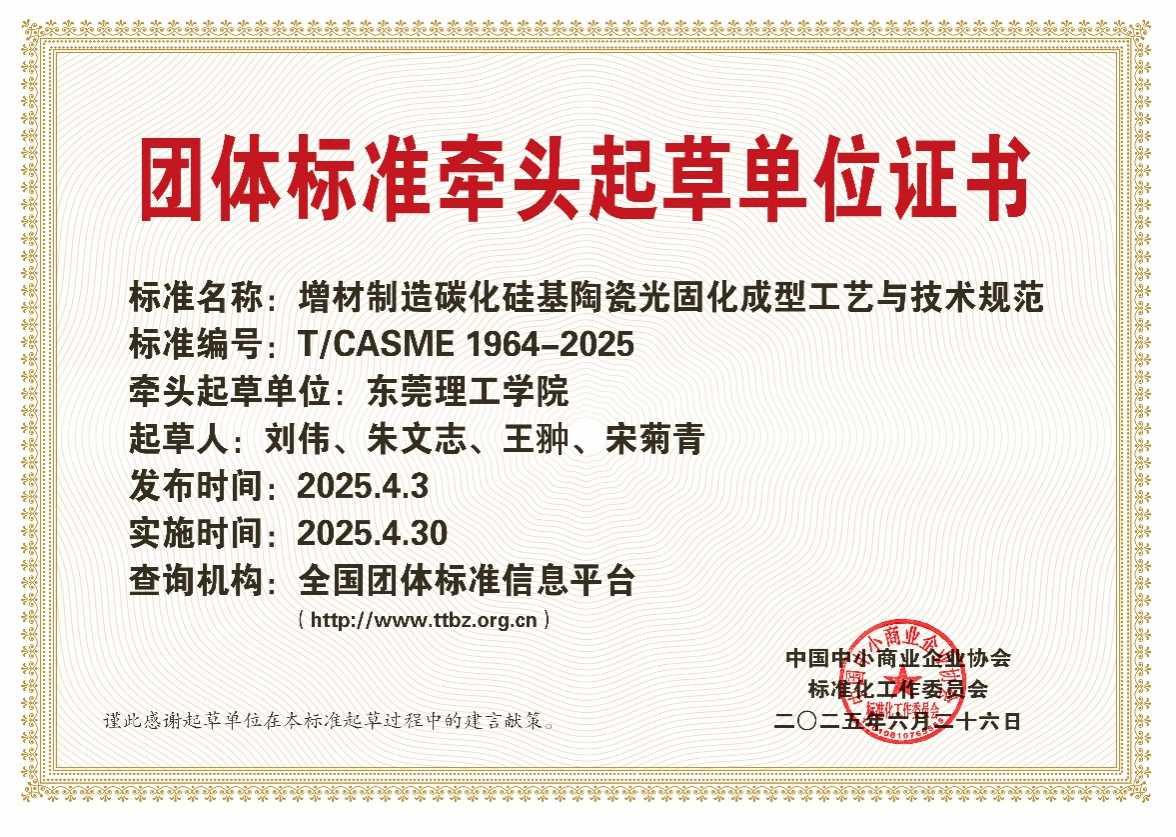 近日,太阳集团tyc151增材制造研究所刘伟教授牵头制定的《增材制造碳化硅基陶瓷光固化成型工艺与技术规范》团体标准(标准编号:T/CASME 1964-2025)成功通过评审,可在全国团体标准信息平台检索,该标准于 2025 年 4 月 3 日发布,4 月 30 日实施。