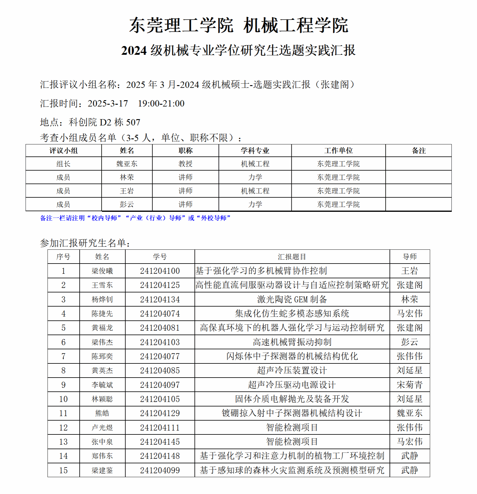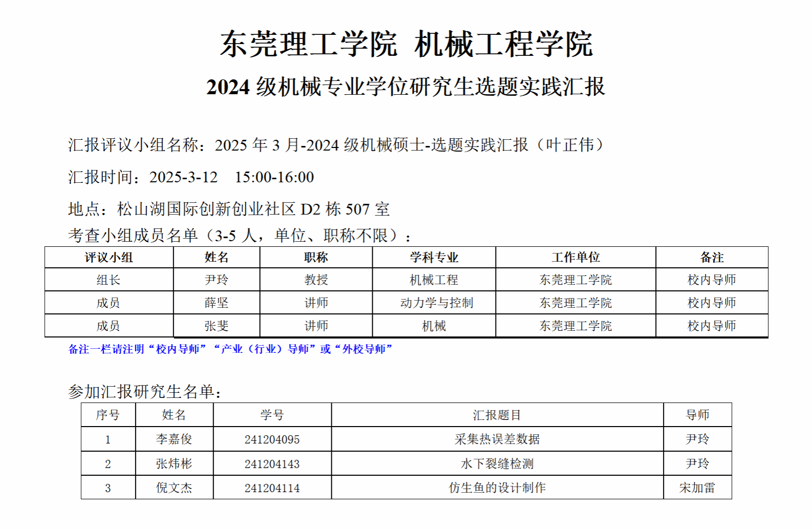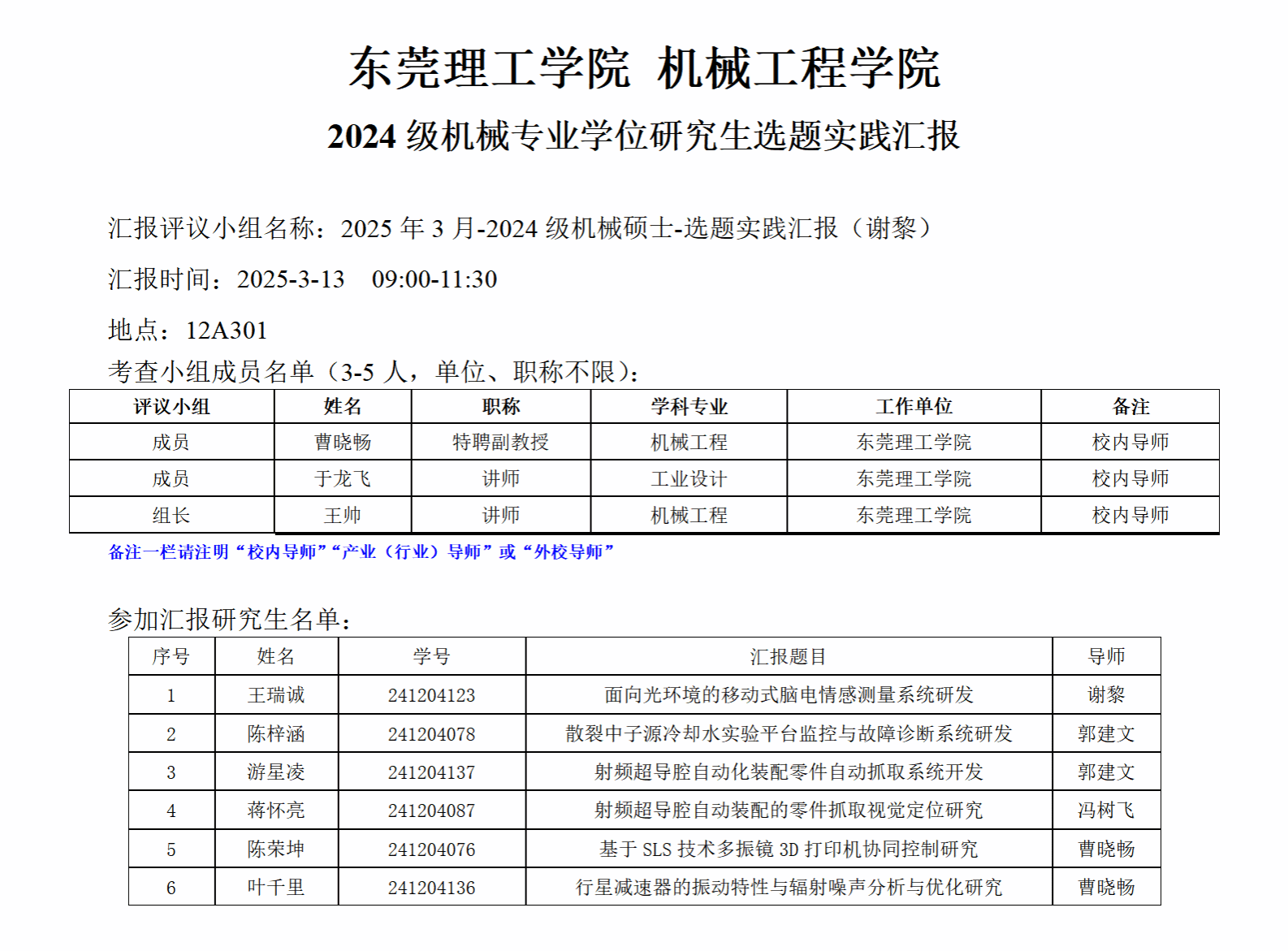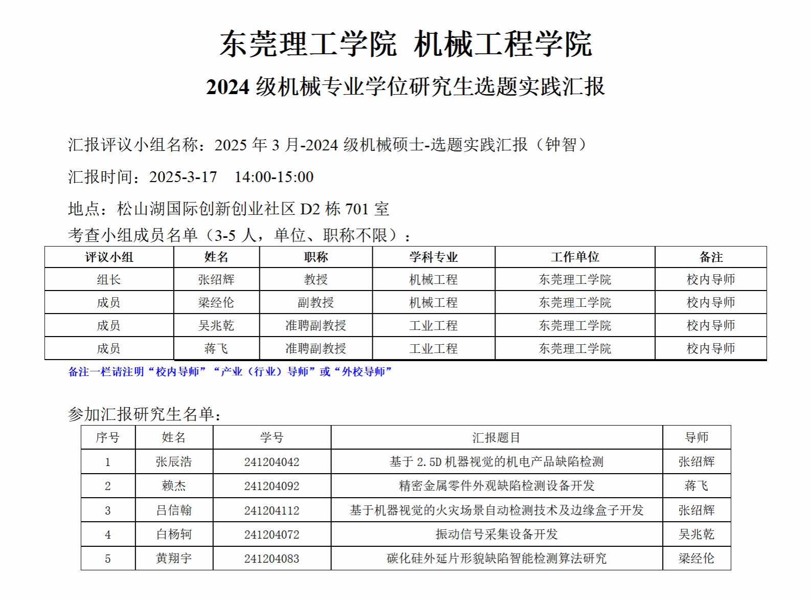2024级机械专业学位研究生选题实践汇报公告