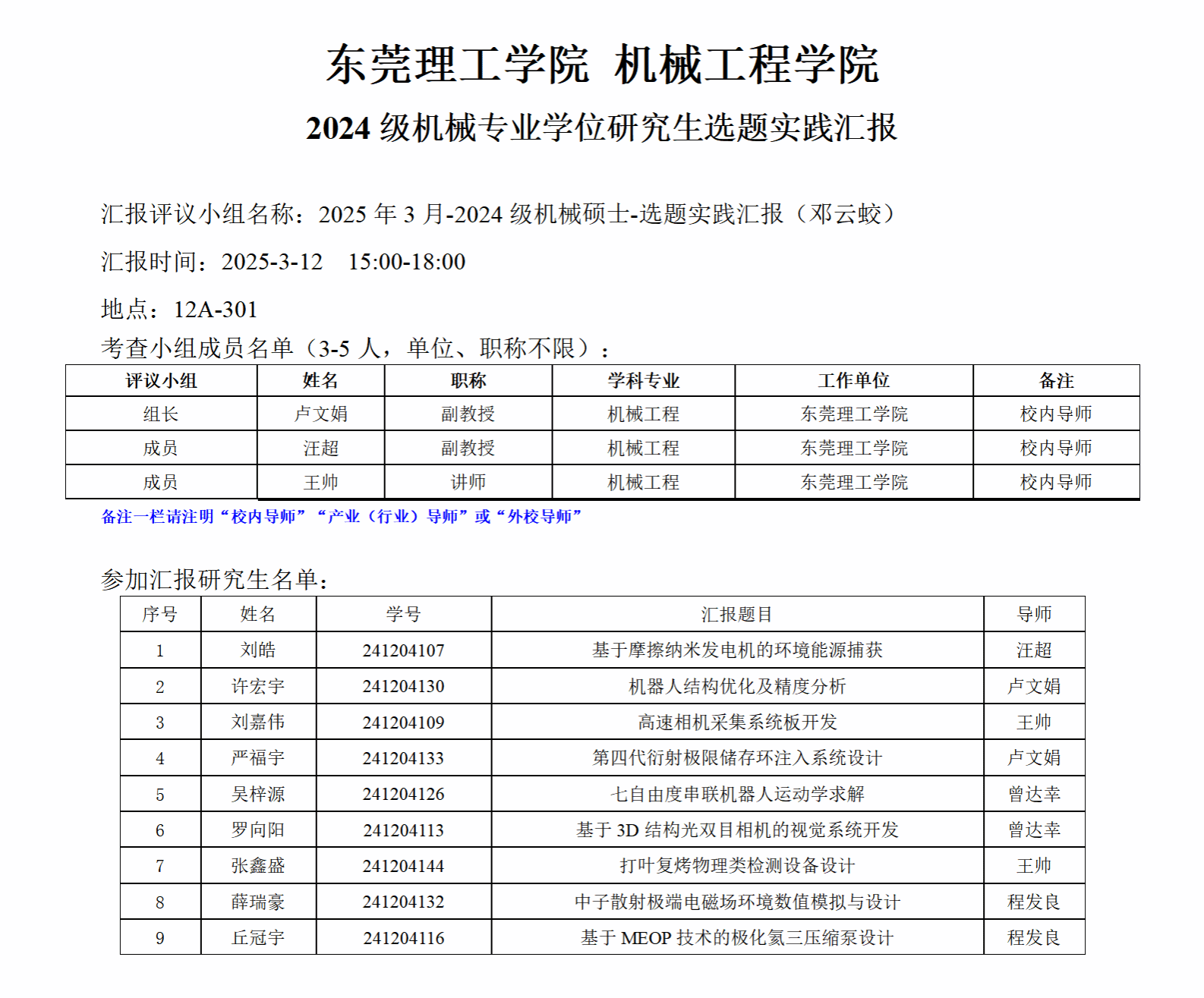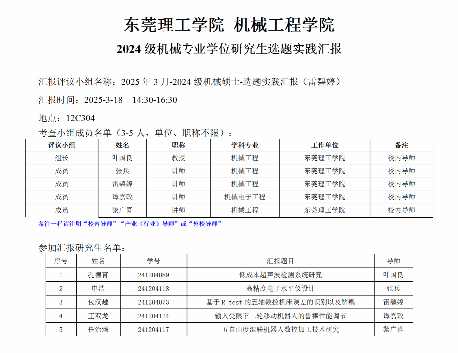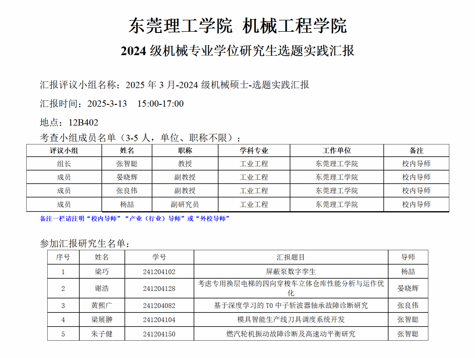 2024级机械专业学位研究生选题实践汇报公告