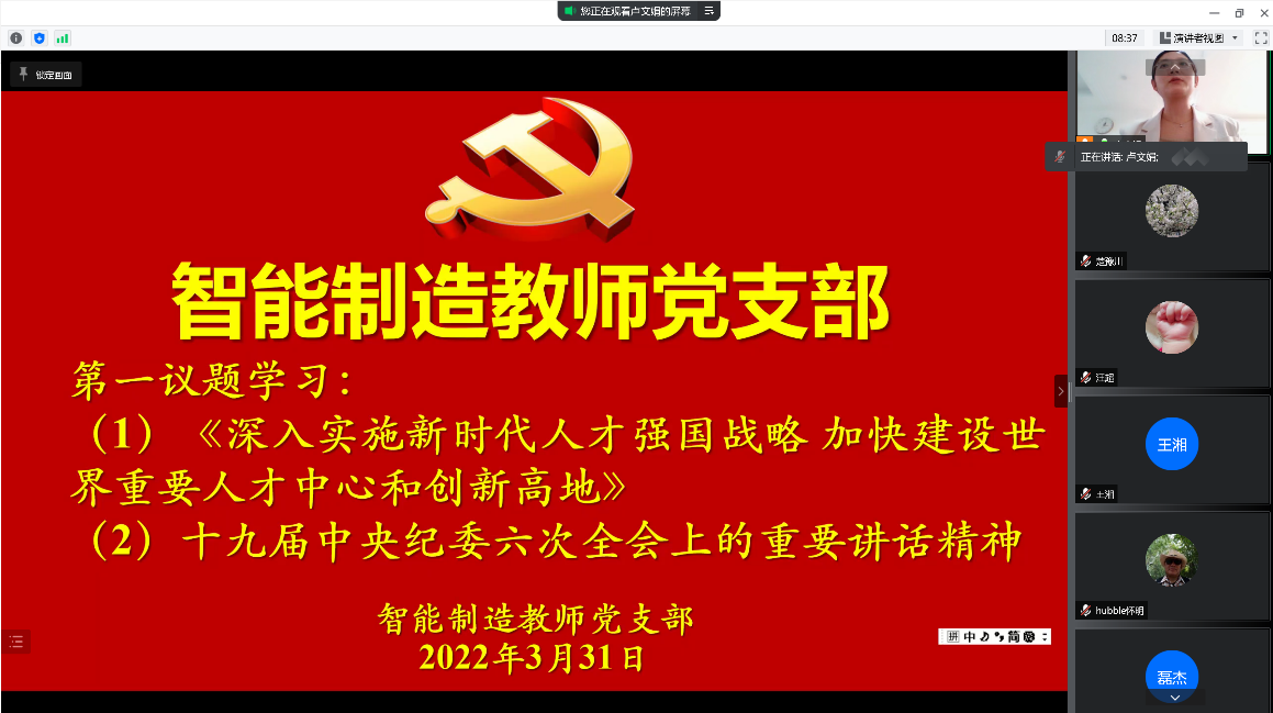 2022年3月31日,太阳集团tyc151智能制造教师党支部通过腾讯会议在线开展了“深化课堂教学改革,提升课程思政质量”主题党日活动,活动由智能制造教师党支部书记卢文娟同志主持,机械工程公司党委书记郭建文同志、智能制造教师党支部党员教师以及公司其他教师参加了活动。