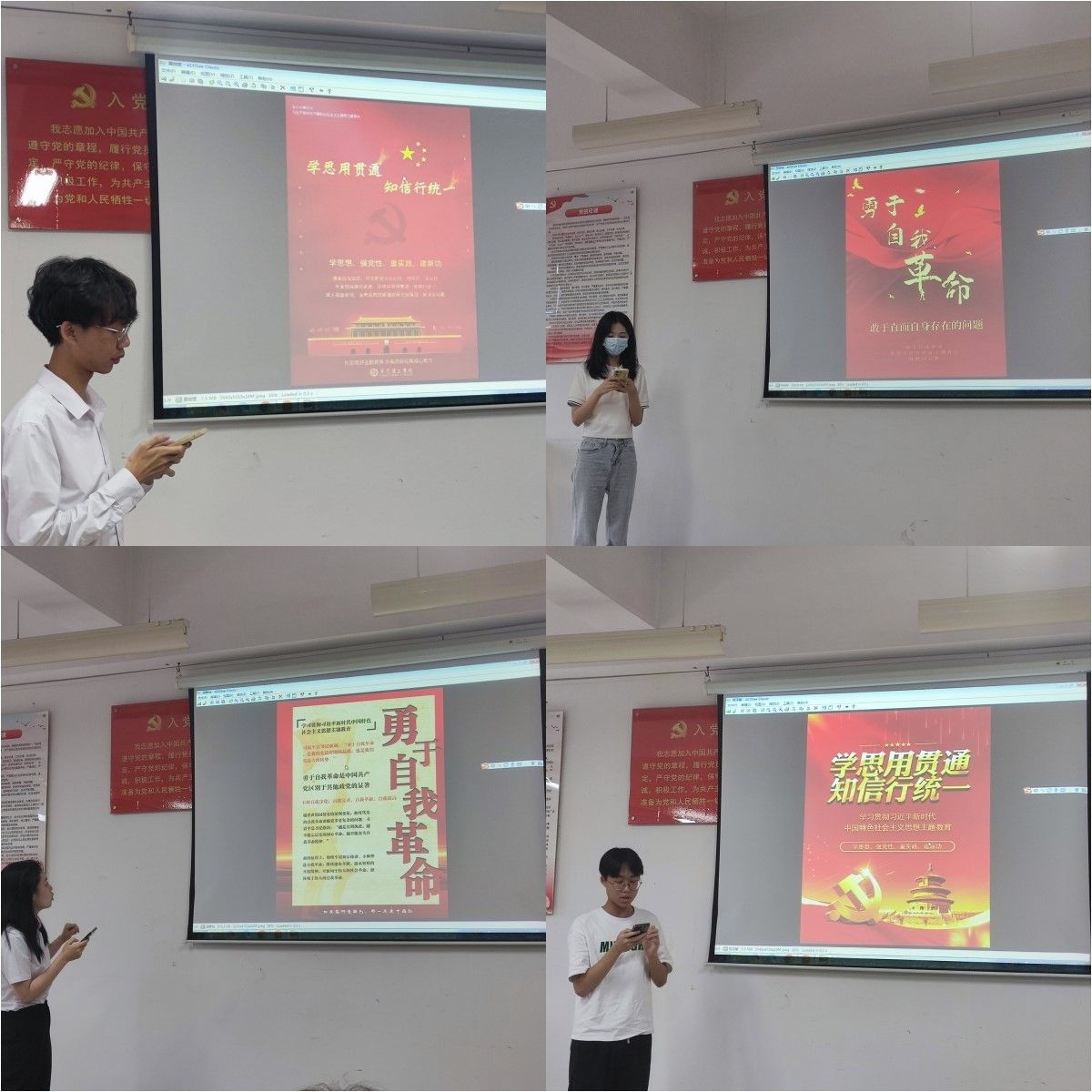 今年5月,支部积极响应公司党委、公司党委主题教育工作部署,创新探索“党建+专业特色”模式,组织支部全体党员、入党积极分子充分发挥工业设计专业能力特长,围绕学习贯彻习近平新时代中国特色社会主义思想主题教育主旨核心,开展主题教育宣传海报设计活动。经过前期精心动员、精细组织策划,活动共收集主题教育宣传海报43张。会上,邀请党员康晓管、梁静怡、刘思、钱泽繁、王舒莹、张铃铃等进行优秀主题教育宣传海报展示、设计理念介绍和活动心得分享。党员梁静怡分享道:“经过支部集体学习、个人自学、读书分享会后,利用自己的专业特长去表达、去总结、去设计宣传海报,让我对主题教育有了更深层次的认识和体悟。作为即将步入社会的毕业生,我将始终以习近平新时代中国特色社会主义思想武装头脑,不忘初心,牢记使命,锐意进取、敢为人先、迎难而上,到祖国最需要的地方建功立业,在推进强国建设、民族复兴的历史伟业中贡献莞工力量。”