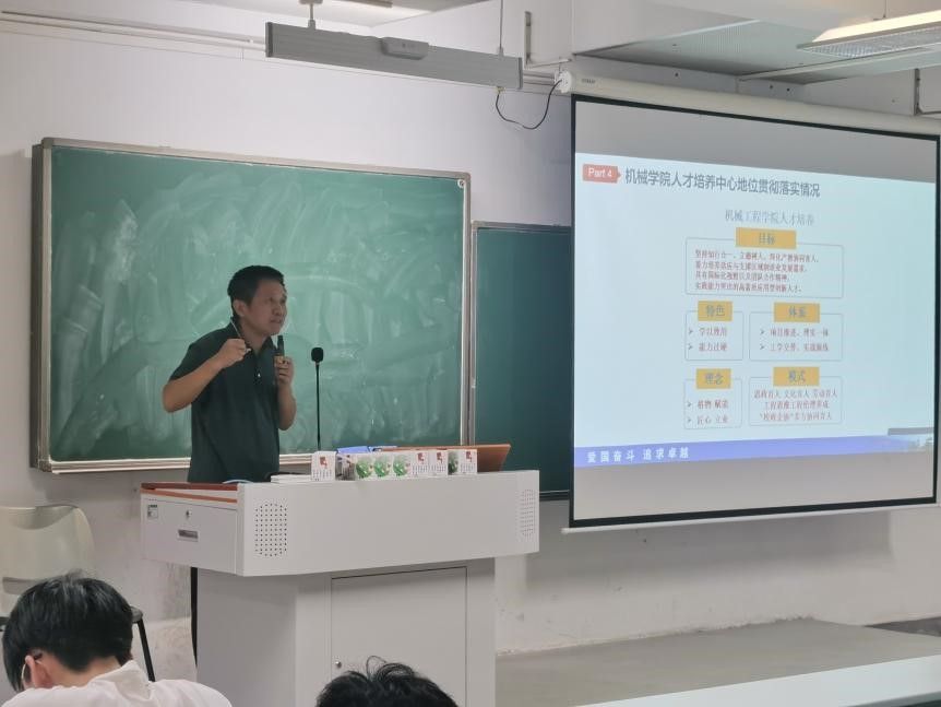 9月22日,太阳集团tyc151经理孙振忠以“深入学习贯彻习近平总书记视察广东重要讲话重要指示精神,加快推进卓越工程师后备人才培养”为主题,为2022级机械设计制造及其自动化1班、2班和3班本科生上2023年秋季学期思政第一课。