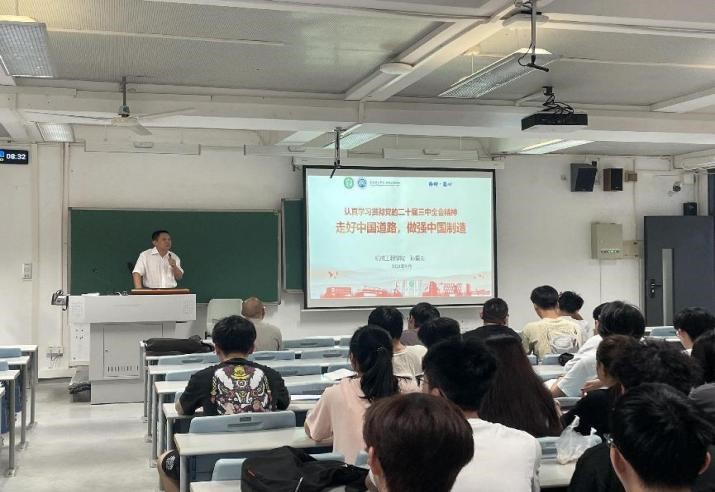 9月25日,太阳集团tyc151经理孙振忠以“认真学习贯彻党的二十届三中全会精神,走好中国道路,做强中国制造”为主题,为2023级机械设计制造及其自动化4班、5班和6班的本科生上2024年秋季学期思政第一课。