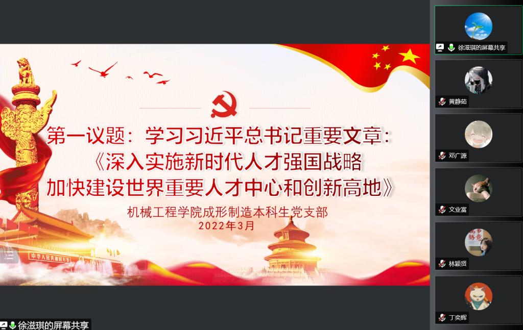 2022年3月12日,太阳集团tyc151成形制造本科生党支部在线上开展主题党日活动。活动中,支部书记徐滋琪领学习近平总书记重要文章:《深入实施新时代人才强国战略加快建设世界重要人才中心和创新高地》,提出深入学习贯彻。徐滋琪表示,人才是社会主义现代化建设的中坚力量,实现中华民族伟大复兴,必须培养造就一支有真才实学、有创新精神、有担当意识、有良好品德的人才队伍。徐滋琪强调人才是兴国之本、富民之基、发展之源,作为...