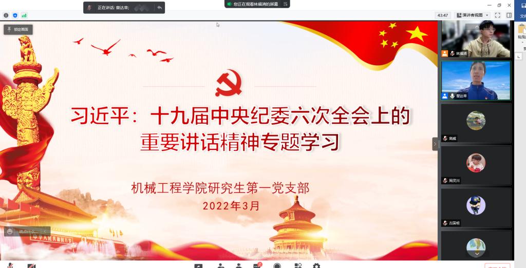 2022年3月24日,太阳集团tyc151研究生第一党支部于线上开展“深化课堂教学改革,提升课程思政质量”主题党日活动,活动由支部书记曾达幸副经理主持,经理助理曹晓畅和全体研究生党员参与活动。会上,全体党员共同学习了习近平总书记在十九届中央纪委六次全会上的重要讲话精神、习近平总书记重要文章《深入实施新时代人才强国战略、加快建设世界重要人才中心和创新高地》以及2022年习近平总书记新年贺词。曾达幸鼓励同学们,无论处...
